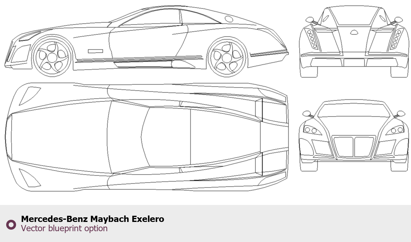 Raster blueprint of the Mercedes-Benz Maybach Exelero Tag. This free downloadable image can be used for graphic projects, digital design, and 3D modeling. The file provides accurate exterior proportions of the vehicle. Body type: Tag.