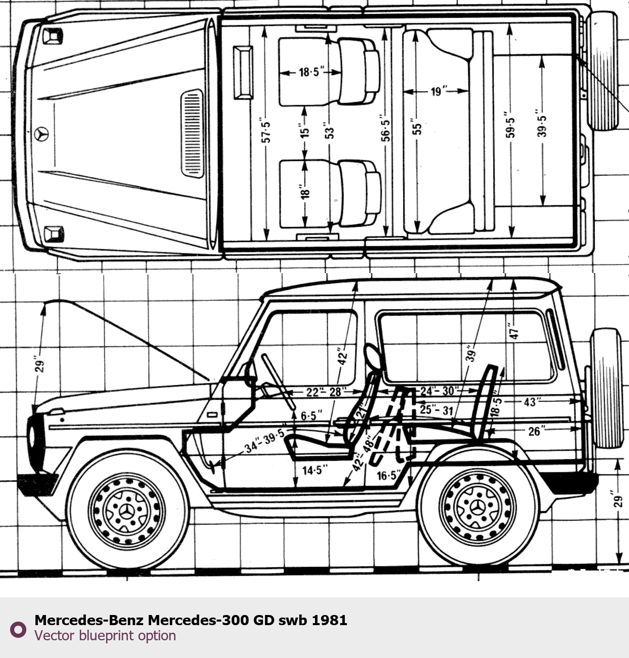 Raster blueprint of the 1981 Mercedes-Benz Mercedes-300 GD swb Tag. This free downloadable image can be used for graphic projects, digital design, and 3D modeling. The file provides accurate exterior proportions of the vehicle. Model year: 1981. Body type: Tag.