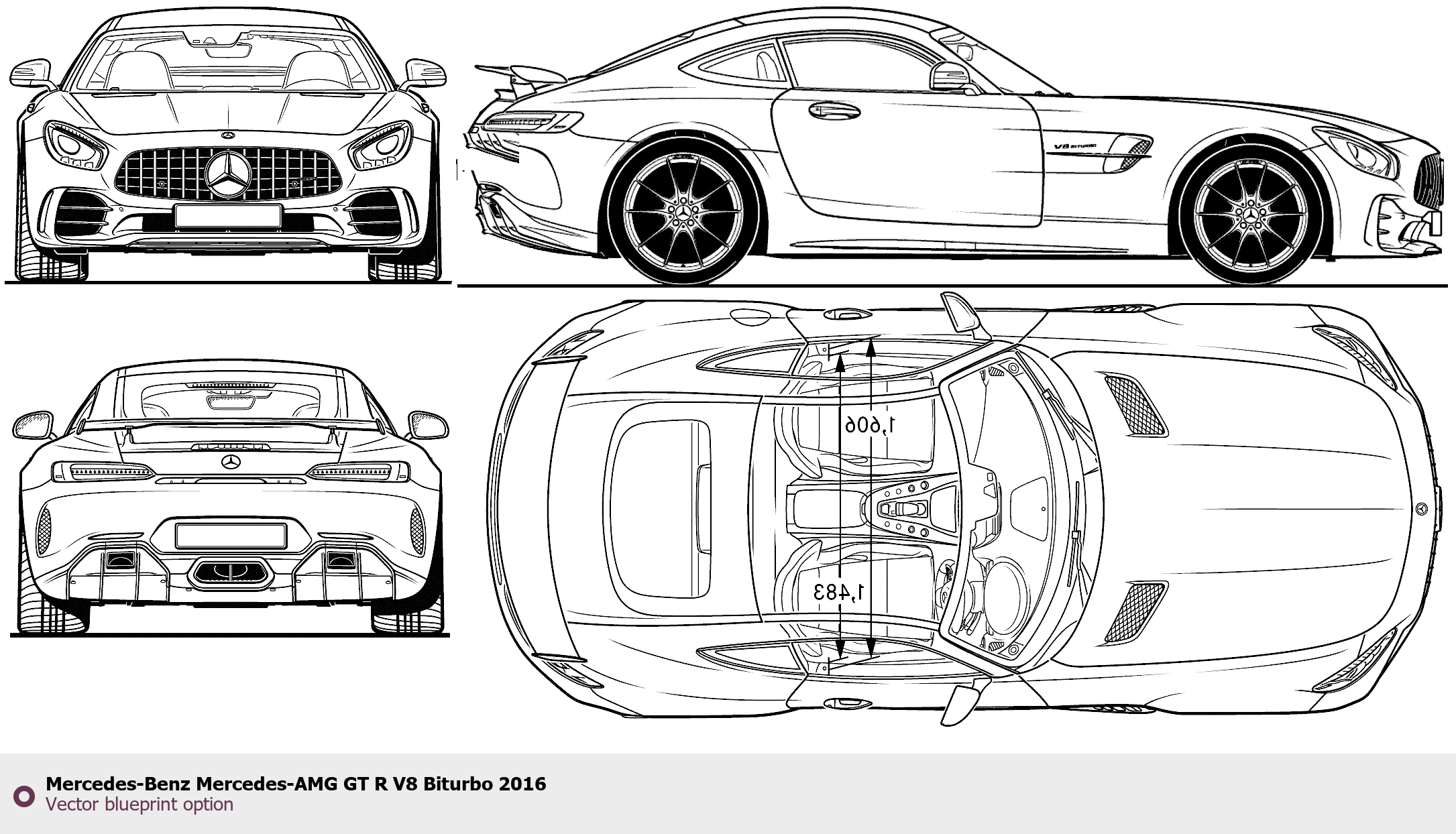 Raster blueprint of the 2016 Mercedes-Benz Mercedes-AMG GT R V8 Biturbo Tag. This free downloadable image can be used for graphic projects, digital design, and 3D modeling. The file provides accurate exterior proportions of the vehicle. Model year: 2016. Body type: Tag.