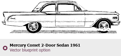 Raster blueprint of the 1961 Mercury Comet 2-Door Sedan Sedan. This free downloadable image can be used for graphic projects, digital design, and 3D modeling. The file provides accurate exterior proportions of the vehicle. Model year: 1961. Body type: Sedan.