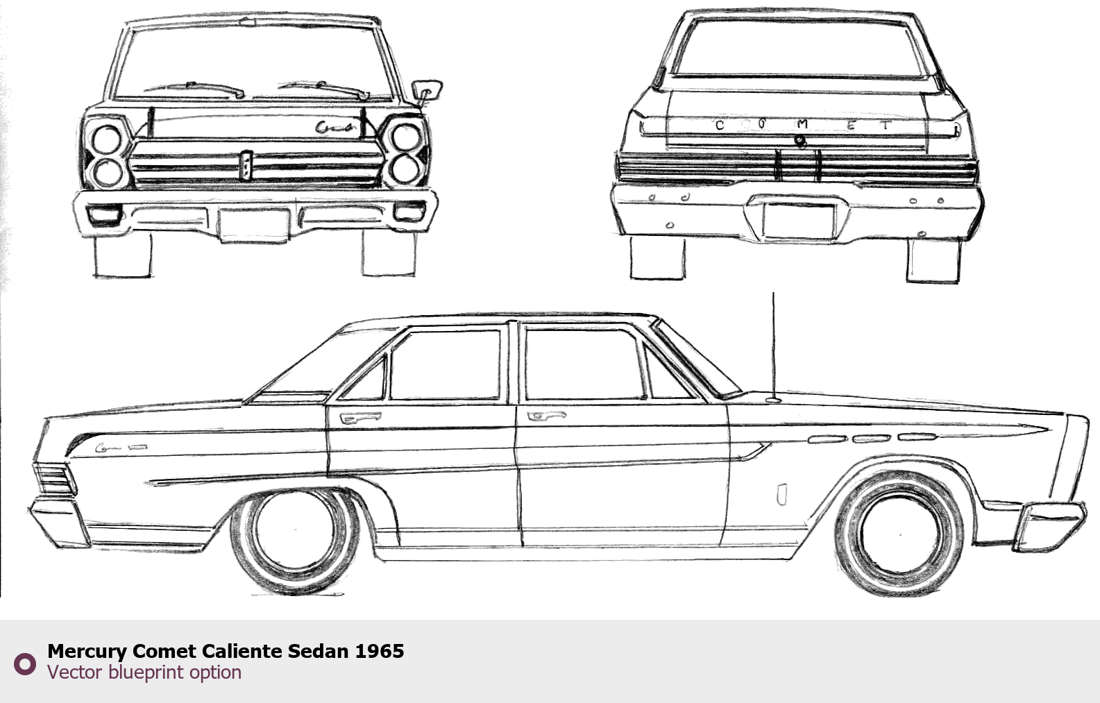Raster blueprint of the 1965 Mercury Comet Caliente Sedan Sedan. This free downloadable image can be used for graphic projects, digital design, and 3D modeling. The file provides accurate exterior proportions of the vehicle. Model year: 1965. Body type: Sedan.