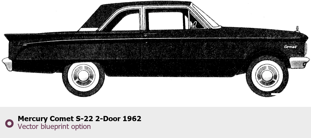 Raster blueprint of the 1962 Mercury Comet S-22 2-Door Tag. This free downloadable image can be used for graphic projects, digital design, and 3D modeling. The file provides accurate exterior proportions of the vehicle. Model year: 1962. Body type: Tag.