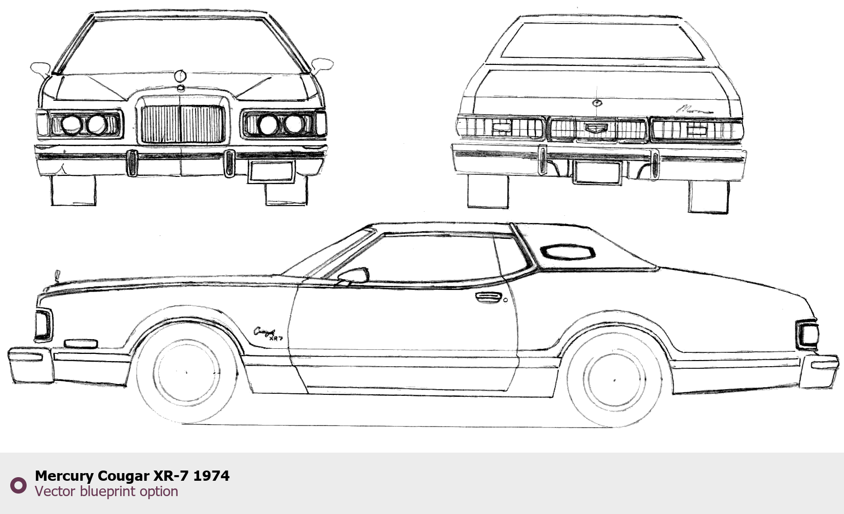 Raster blueprint of the 1974 Mercury Cougar XR-7 Tag. This free downloadable image can be used for graphic projects, digital design, and 3D modeling. The file provides accurate exterior proportions of the vehicle. Model year: 1974. Body type: Tag.