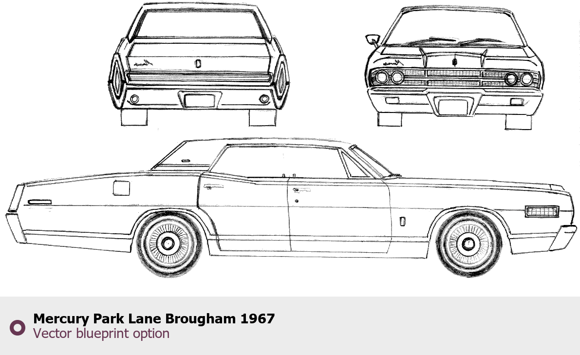 Raster blueprint of the 1967 Mercury Park Lane Brougham Tag. This free downloadable image can be used for graphic projects, digital design, and 3D modeling. The file provides accurate exterior proportions of the vehicle. Model year: 1967. Body type: Tag.