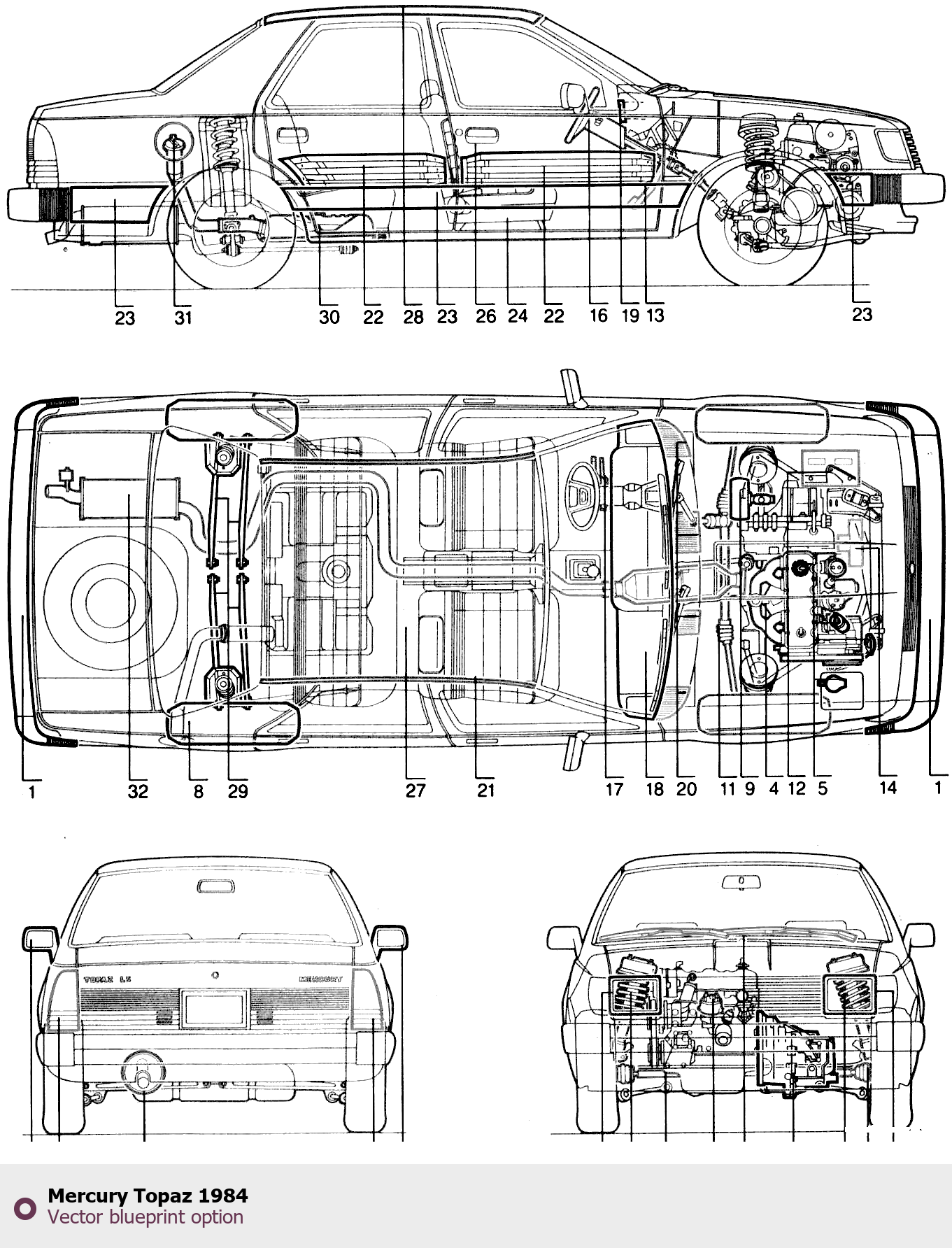 Raster blueprint of the 1984 Mercury Topaz Tag. This free downloadable image can be used for graphic projects, digital design, and 3D modeling. The file provides accurate exterior proportions of the vehicle. Model year: 1984. Body type: Tag.