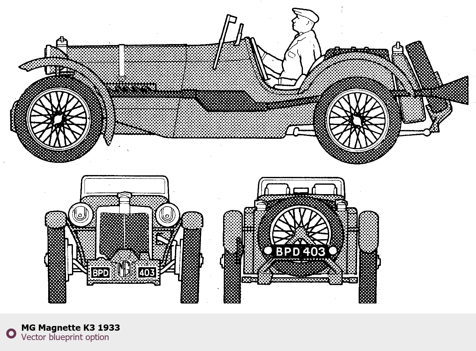 Raster blueprint of the 1933 MG Magnette K3 Hatchback. This free downloadable image can be used for graphic projects, digital design, and 3D modeling. The file provides accurate exterior proportions of the vehicle. Model year: 1933. Body type: Hatchback.
