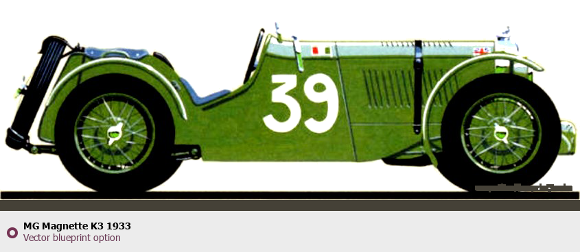 Raster blueprint of the 1933 MG Magnette K3 Hatchback. This free downloadable image can be used for graphic projects, digital design, and 3D modeling. The file provides accurate exterior proportions of the vehicle. Model year: 1933. Body type: Hatchback.