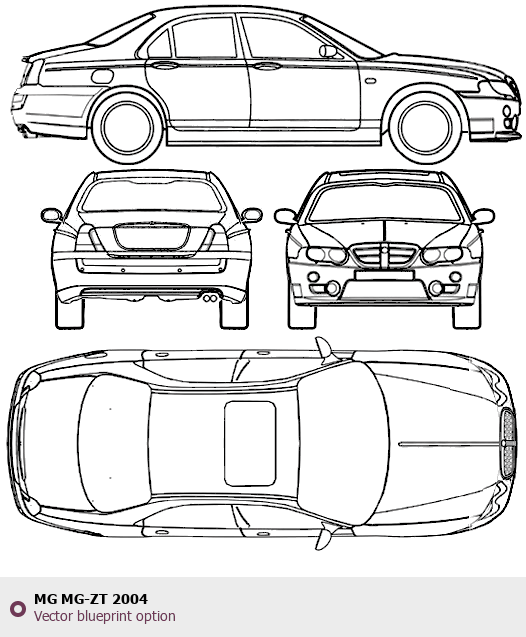 Raster blueprint of the 2004 MG MG-ZT Sedan. This free downloadable image can be used for graphic projects, digital design, and 3D modeling. The file provides accurate exterior proportions of the vehicle. Model year: 2004. Body type: Sedan.