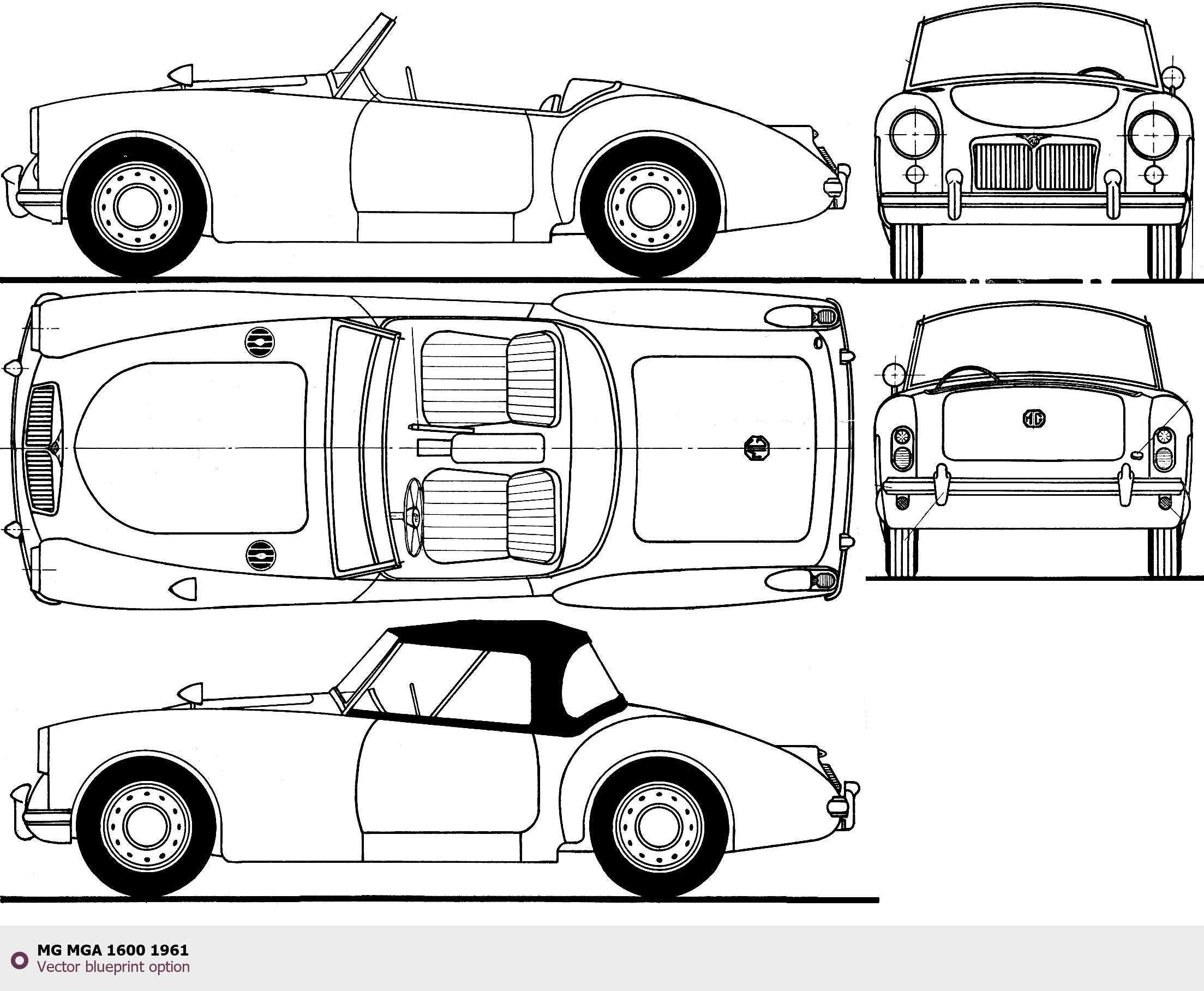 Raster blueprint of the 1961 MG MGA 1600 Cabriolet. This free downloadable image can be used for graphic projects, digital design, and 3D modeling. The file provides accurate exterior proportions of the vehicle. Model year: 1961. Body type: Cabriolet.