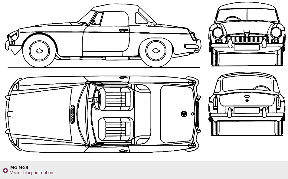 Raster blueprint of the MG MGB Roadster. This free downloadable image can be used for graphic projects, digital design, and 3D modeling. The file provides accurate exterior proportions of the vehicle. Body type: Roadster.