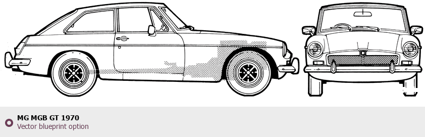 Raster blueprint of the 1970 MG MGB GT Roadster. This free downloadable image can be used for graphic projects, digital design, and 3D modeling. The file provides accurate exterior proportions of the vehicle. Model year: 1970. Body type: Roadster.