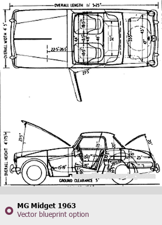 Raster blueprint of the 1963 MG Midget Roadster. This free downloadable image can be used for graphic projects, digital design, and 3D modeling. The file provides accurate exterior proportions of the vehicle. Model year: 1963. Body type: Roadster.