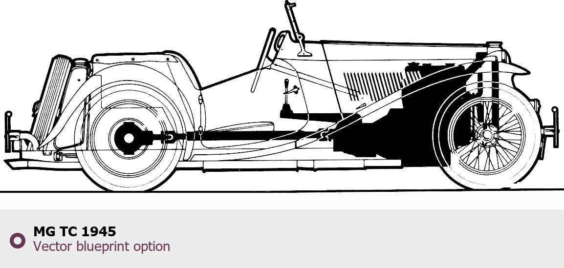 Raster blueprint of the 1945 MG TC Hatchback. This free downloadable image can be used for graphic projects, digital design, and 3D modeling. The file provides accurate exterior proportions of the vehicle. Model year: 1945. Body type: Hatchback.