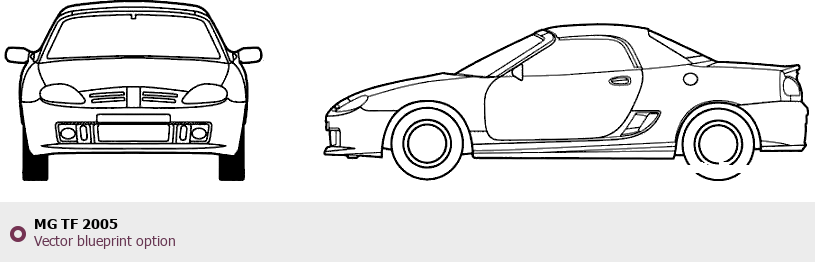 Raster blueprint of the 2005 MG TF Roadster. This free downloadable image can be used for graphic projects, digital design, and 3D modeling. The file provides accurate exterior proportions of the vehicle. Model year: 2005. Body type: Roadster.
