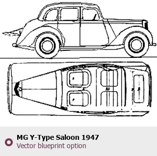 Raster blueprint of the 1947 MG Y-Type Saloon Sedan. This free downloadable image can be used for graphic projects, digital design, and 3D modeling. The file provides accurate exterior proportions of the vehicle. Model year: 1947. Body type: Sedan.