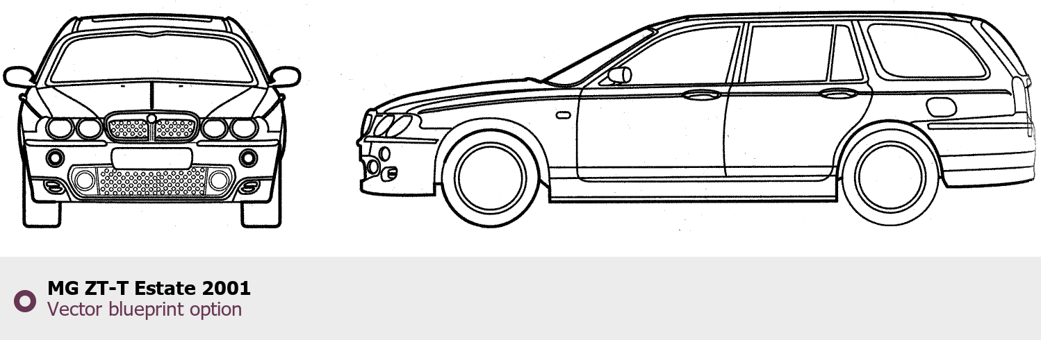 Raster blueprint of the 2001 MG ZT-T Estate Wagon. This free downloadable image can be used for graphic projects, digital design, and 3D modeling. The file provides accurate exterior proportions of the vehicle. Model year: 2001. Body type: Wagon.
