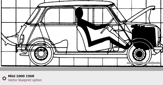 Raster blueprint of the 1968 Mini 1000 Hatchback. This free downloadable image can be used for graphic projects, digital design, and 3D modeling. The file provides accurate exterior proportions of the vehicle. Model year: 1968. Body type: Hatchback.