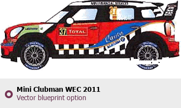 Raster blueprint of the 2011 Mini Clubman WEC Hatchback. This free downloadable image can be used for graphic projects, digital design, and 3D modeling. The file provides accurate exterior proportions of the vehicle. Model year: 2011. Body type: Hatchback.