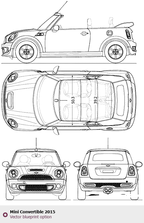 Raster blueprint of the 2015 Mini Convertible Hatchback. This free downloadable image can be used for graphic projects, digital design, and 3D modeling. The file provides accurate exterior proportions of the vehicle. Model year: 2015. Body type: Hatchback.