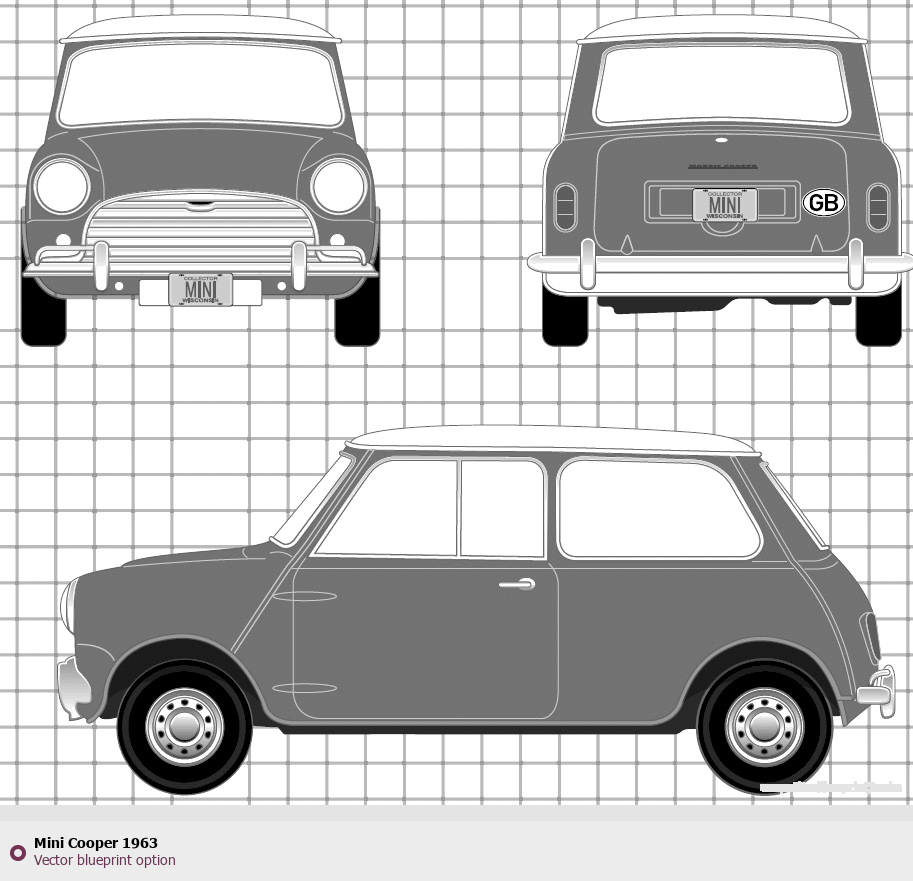 Raster blueprint of the 1963 Mini Cooper Hatchback. This free downloadable image can be used for graphic projects, digital design, and 3D modeling. The file provides accurate exterior proportions of the vehicle. Model year: 1963. Body type: Hatchback.