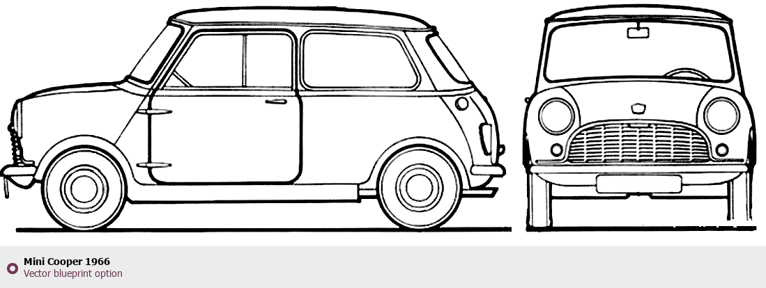 Raster blueprint of the 1966 Mini Cooper Hatchback. This free downloadable image can be used for graphic projects, digital design, and 3D modeling. The file provides accurate exterior proportions of the vehicle. Model year: 1966. Body type: Hatchback.