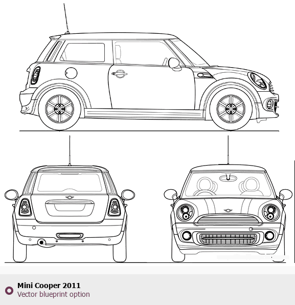 Raster blueprint of the 2011 Mini Cooper Hatchback. This free downloadable image can be used for graphic projects, digital design, and 3D modeling. The file provides accurate exterior proportions of the vehicle. Model year: 2011. Body type: Hatchback.