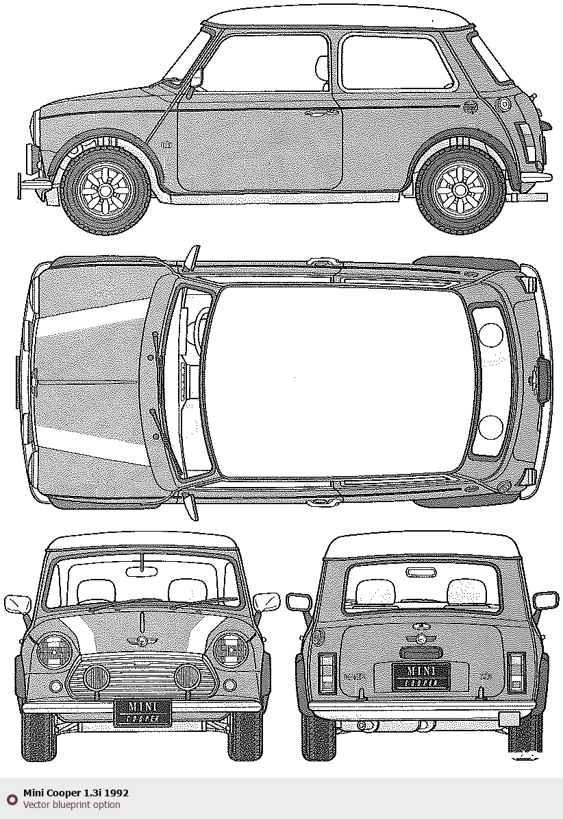 Raster blueprint of the 1992 Mini Cooper 1.3i Hatchback. This free downloadable image can be used for graphic projects, digital design, and 3D modeling. The file provides accurate exterior proportions of the vehicle. Model year: 1992. Body type: Hatchback.