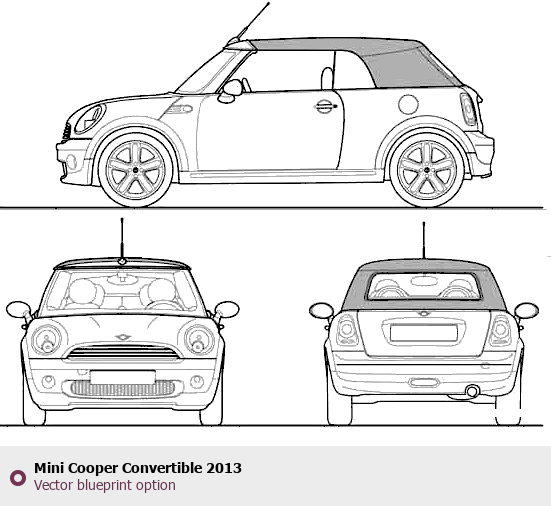 Raster blueprint of the 2013 Mini Cooper Convertible Hatchback. This free downloadable image can be used for graphic projects, digital design, and 3D modeling. The file provides accurate exterior proportions of the vehicle. Model year: 2013. Body type: Hatchback.