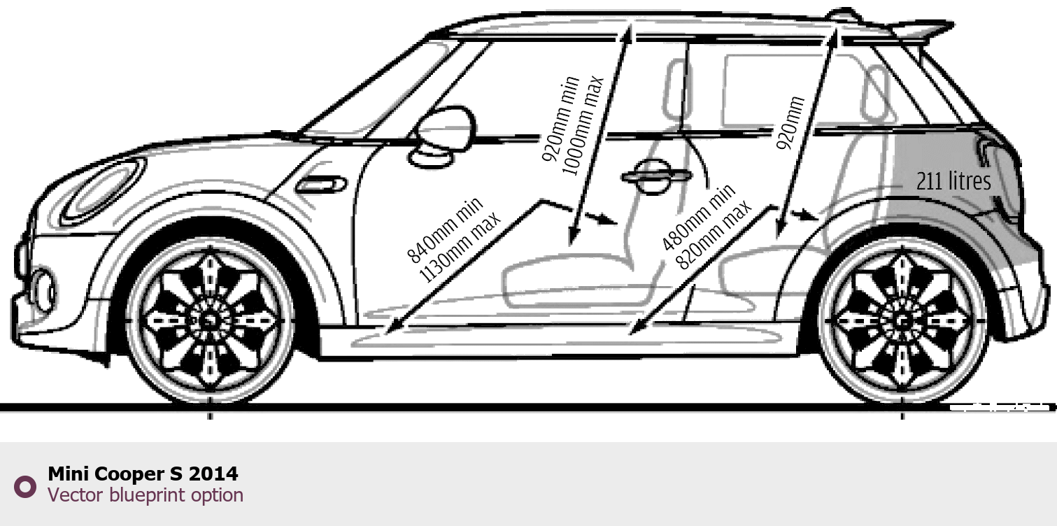 Raster blueprint of the 2014 Mini Cooper S Hatchback. This free downloadable image can be used for graphic projects, digital design, and 3D modeling. The file provides accurate exterior proportions of the vehicle. Model year: 2014. Body type: Hatchback.