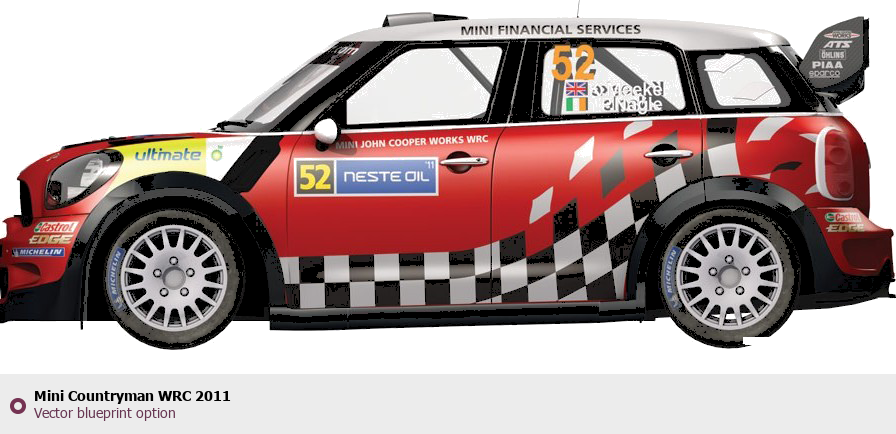 Raster blueprint of the 2011 Mini Countryman WRC Hatchback. This free downloadable image can be used for graphic projects, digital design, and 3D modeling. The file provides accurate exterior proportions of the vehicle. Model year: 2011. Body type: Hatchback.