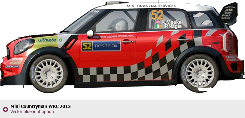Raster blueprint of the 2012 Mini Countryman WRC Hatchback. This free downloadable image can be used for graphic projects, digital design, and 3D modeling. The file provides accurate exterior proportions of the vehicle. Model year: 2012. Body type: Hatchback.