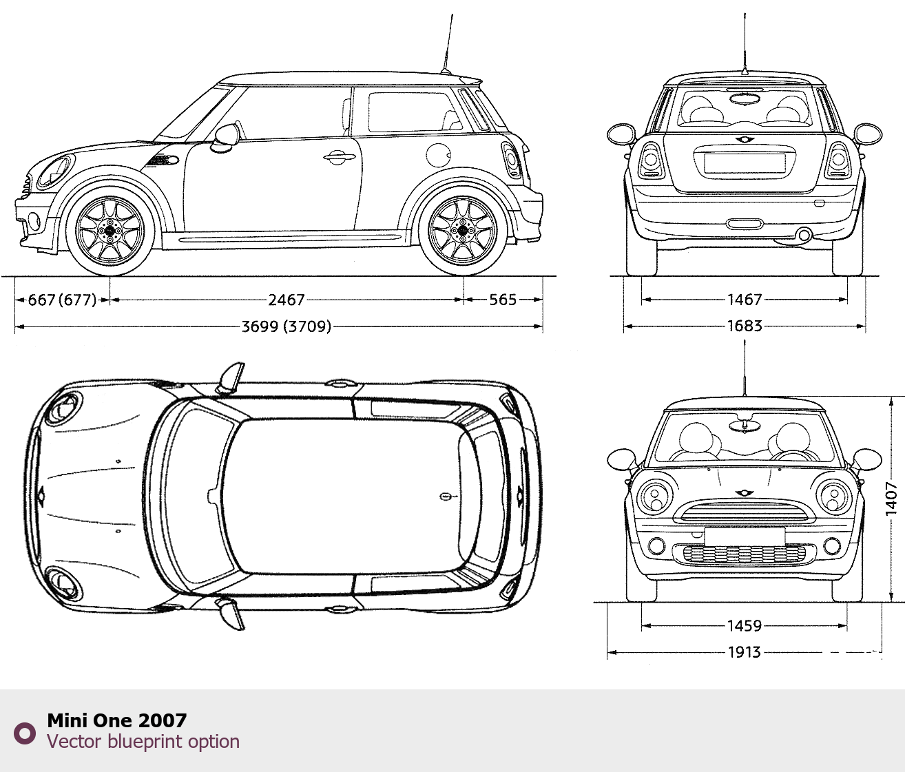Raster blueprint of the 2007 Mini One Hatchback. This free downloadable image can be used for graphic projects, digital design, and 3D modeling. The file provides accurate exterior proportions of the vehicle. Model year: 2007. Body type: Hatchback.