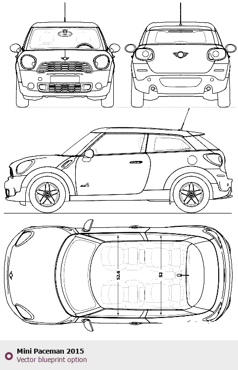 Raster blueprint of the 2015 Mini Paceman Hatchback. This free downloadable image can be used for graphic projects, digital design, and 3D modeling. The file provides accurate exterior proportions of the vehicle. Model year: 2015. Body type: Hatchback.