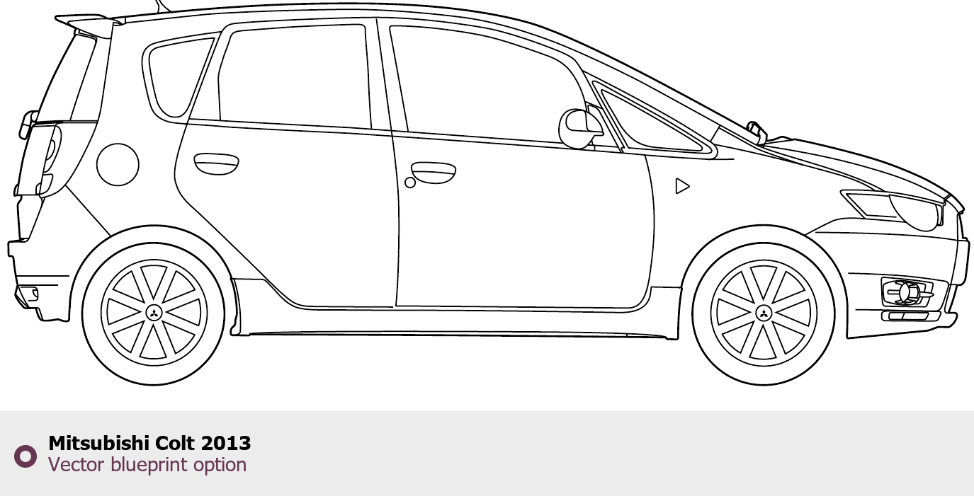 Raster blueprint of the 2013 Mitsubishi Colt Tag. This free downloadable image can be used for graphic projects, digital design, and 3D modeling. The file provides accurate exterior proportions of the vehicle. Model year: 2013. Body type: Tag.