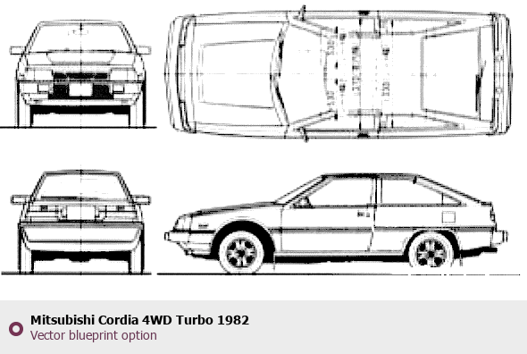 Raster blueprint of the 1982 Mitsubishi Cordia 4WD Turbo Hatchback. This free downloadable image can be used for graphic projects, digital design, and 3D modeling. The file provides accurate exterior proportions of the vehicle. Model year: 1982. Body type: Hatchback.