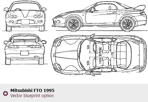 Raster blueprint of the 1995 Mitsubishi FTO Coupe. This free downloadable image can be used for graphic projects, digital design, and 3D modeling. The file provides accurate exterior proportions of the vehicle. Model year: 1995. Body type: Coupe.
