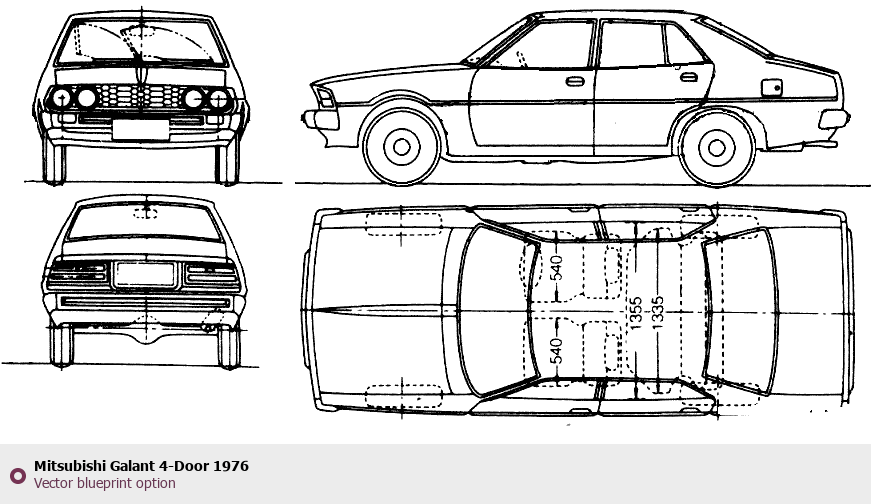 Raster blueprint of the 1976 Mitsubishi Galant 4-Door Tag. This free downloadable image can be used for graphic projects, digital design, and 3D modeling. The file provides accurate exterior proportions of the vehicle. Model year: 1976. Body type: Tag.