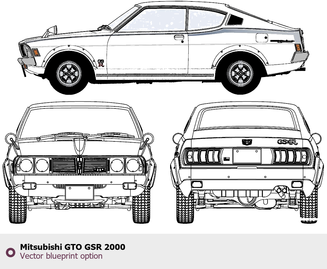Raster blueprint of the 2000 Mitsubishi GTO GSR Coupe. This free downloadable image can be used for graphic projects, digital design, and 3D modeling. The file provides accurate exterior proportions of the vehicle. Model year: 2000. Body type: Coupe.
