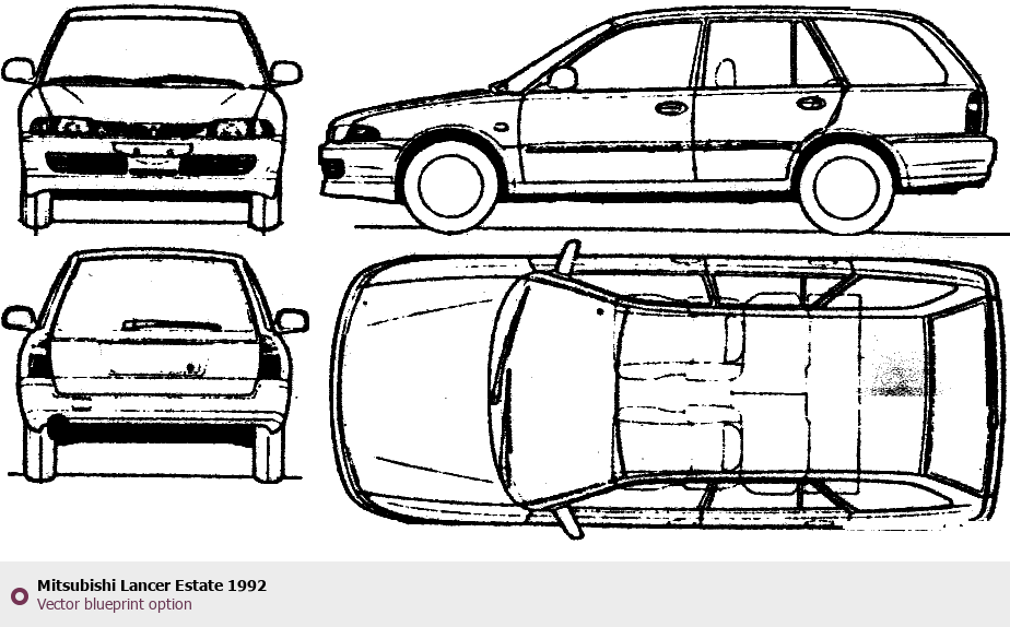 Raster blueprint of the 1992 Mitsubishi Lancer Estate Wagon. This free downloadable image can be used for graphic projects, digital design, and 3D modeling. The file provides accurate exterior proportions of the vehicle. Model year: 1992. Body type: Wagon.