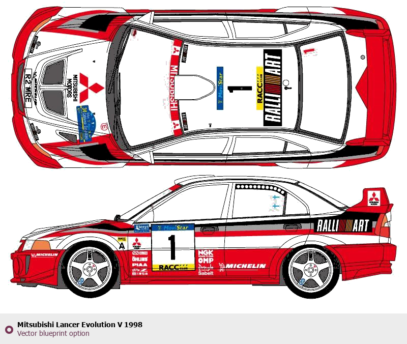 Raster blueprint of the 1998 Mitsubishi Lancer Evolution V Sedan. This free downloadable image can be used for graphic projects, digital design, and 3D modeling. The file provides accurate exterior proportions of the vehicle. Model year: 1998. Body type: Sedan.