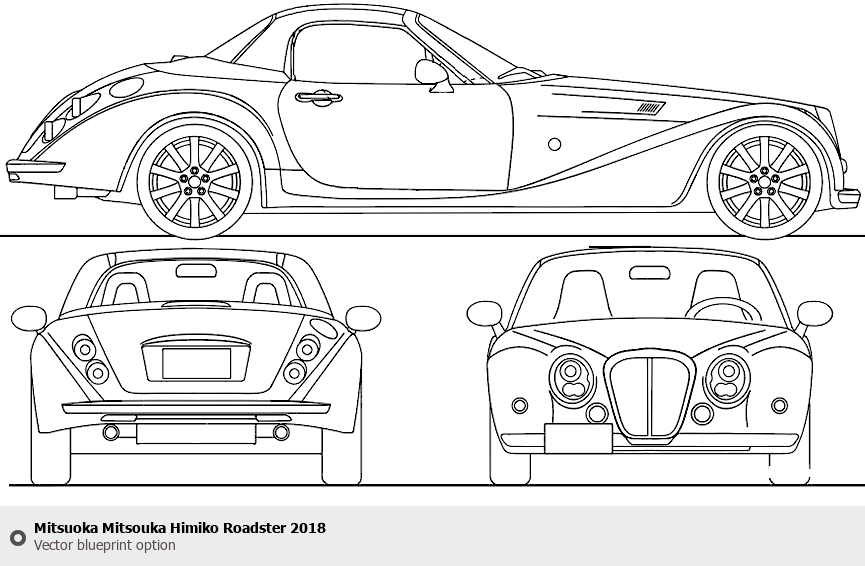 Raster blueprint of the 2018 Mitsuoka Mitsouka Himiko Roadster Roadster. This free downloadable image can be used for graphic projects, digital design, and 3D modeling. The file provides accurate exterior proportions of the vehicle. Model year: 2018. Body type: Roadster.