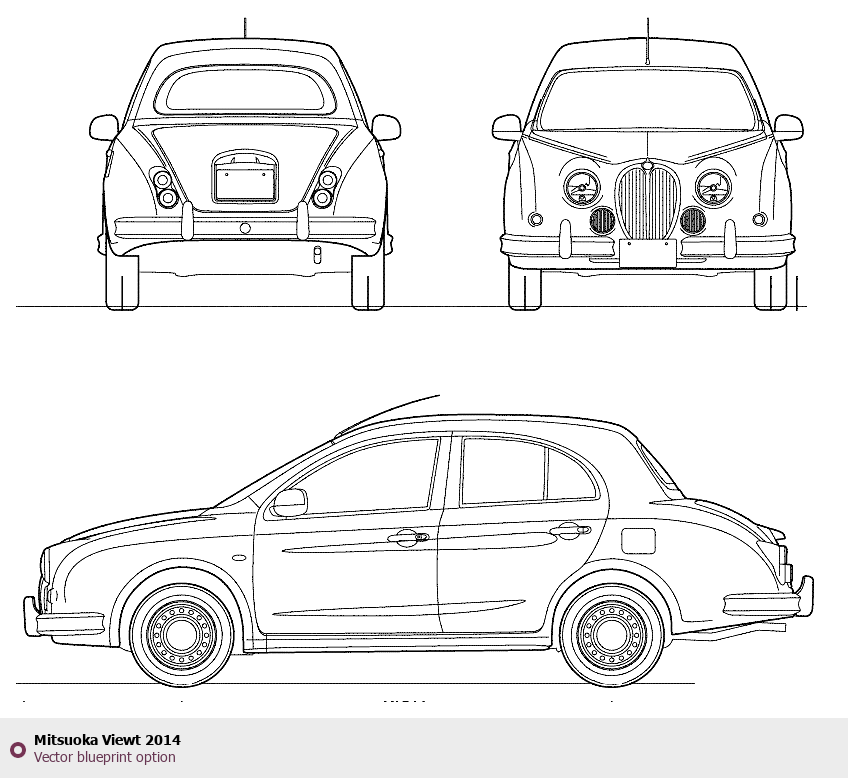 Raster blueprint of the 2014 Mitsuoka Viewt Tag. This free downloadable image can be used for graphic projects, digital design, and 3D modeling. The file provides accurate exterior proportions of the vehicle. Model year: 2014. Body type: Tag.