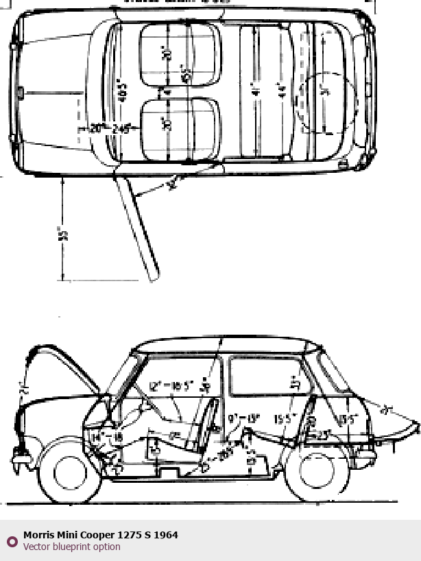 Raster blueprint of the 1964 Morris Mini Cooper 1275 S Hatchback. This free downloadable image can be used for graphic projects, digital design, and 3D modeling. The file provides accurate exterior proportions of the vehicle. Model year: 1964. Body type: Hatchback.