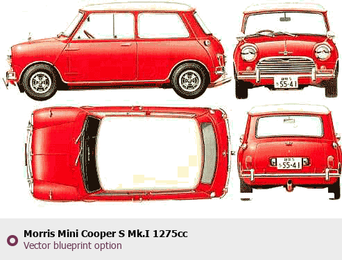 Raster blueprint of the Morris Mini Cooper S Mk.I 1275cc Hatchback. This free downloadable image can be used for graphic projects, digital design, and 3D modeling. The file provides accurate exterior proportions of the vehicle. Body type: Hatchback.