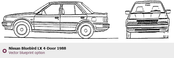 Raster blueprint of the 1988 Nissan Bluebird LX 4-Door Tag. This free downloadable image can be used for graphic projects, digital design, and 3D modeling. The file provides accurate exterior proportions of the vehicle. Model year: 1988. Body type: Tag.