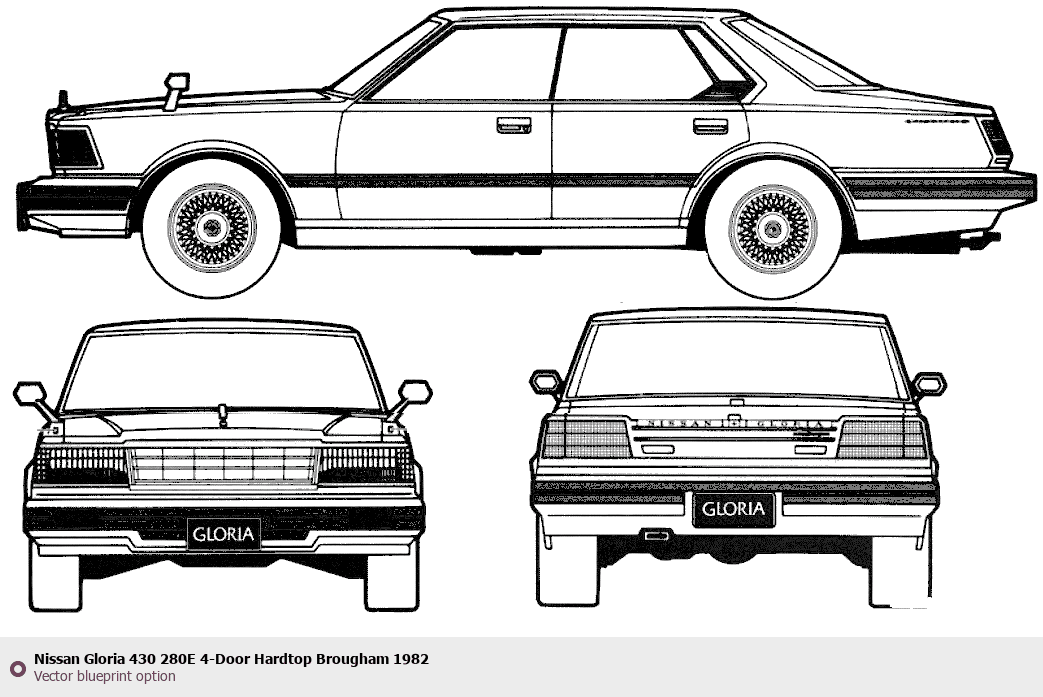 Raster blueprint of the 1982 Nissan Gloria 430 280E 4-Door Hardtop Brougham Tag. This free downloadable image can be used for graphic projects, digital design, and 3D modeling. The file provides accurate exterior proportions of the vehicle. Model year: 1982. Body type: Tag.