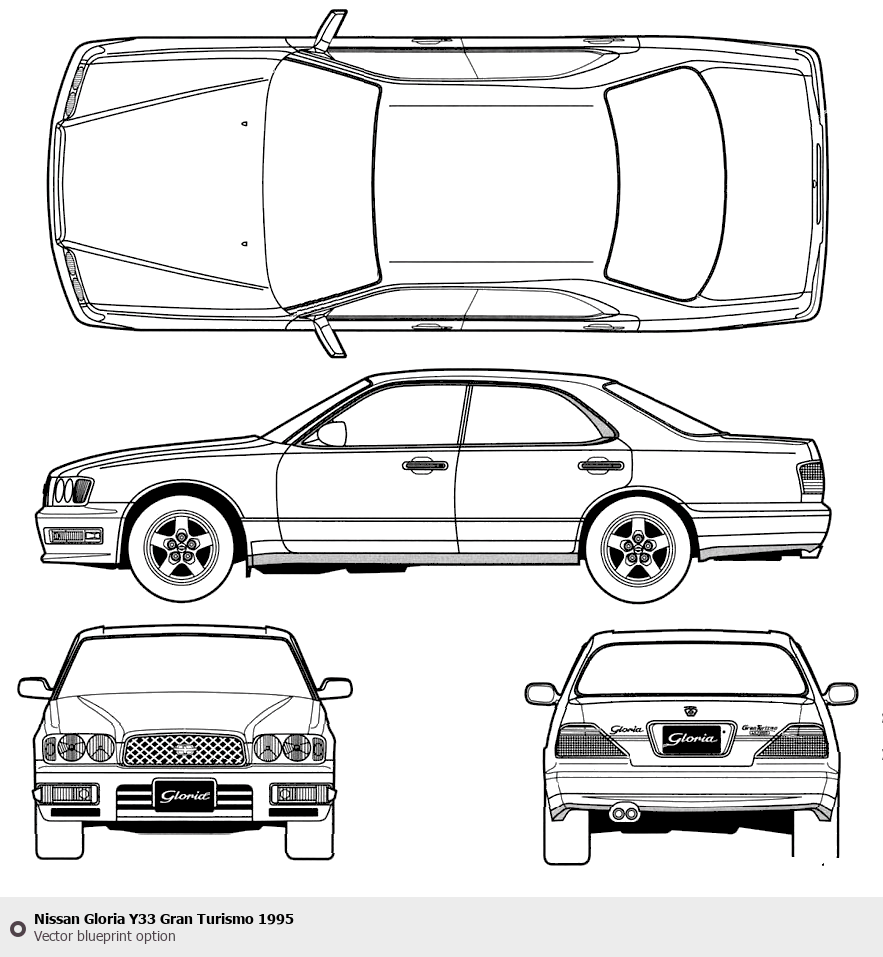 Raster blueprint of the 1995 Nissan Gloria Y33 Gran Turismo Tag. This free downloadable image can be used for graphic projects, digital design, and 3D modeling. The file provides accurate exterior proportions of the vehicle. Model year: 1995. Body type: Tag.