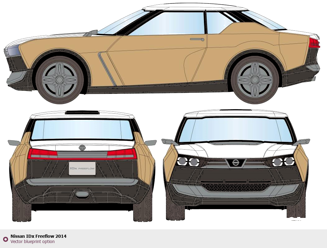 Raster blueprint of the 2014 Nissan IDx Freeflow Tag. This free downloadable image can be used for graphic projects, digital design, and 3D modeling. The file provides accurate exterior proportions of the vehicle. Model year: 2014. Body type: Tag.