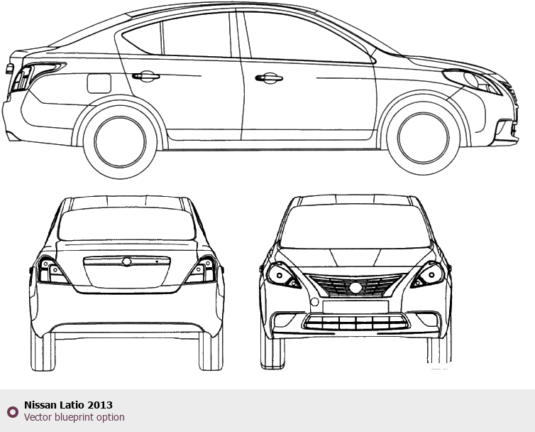Raster blueprint of the 2013 Nissan Latio Tag. This free downloadable image can be used for graphic projects, digital design, and 3D modeling. The file provides accurate exterior proportions of the vehicle. Model year: 2013. Body type: Tag.