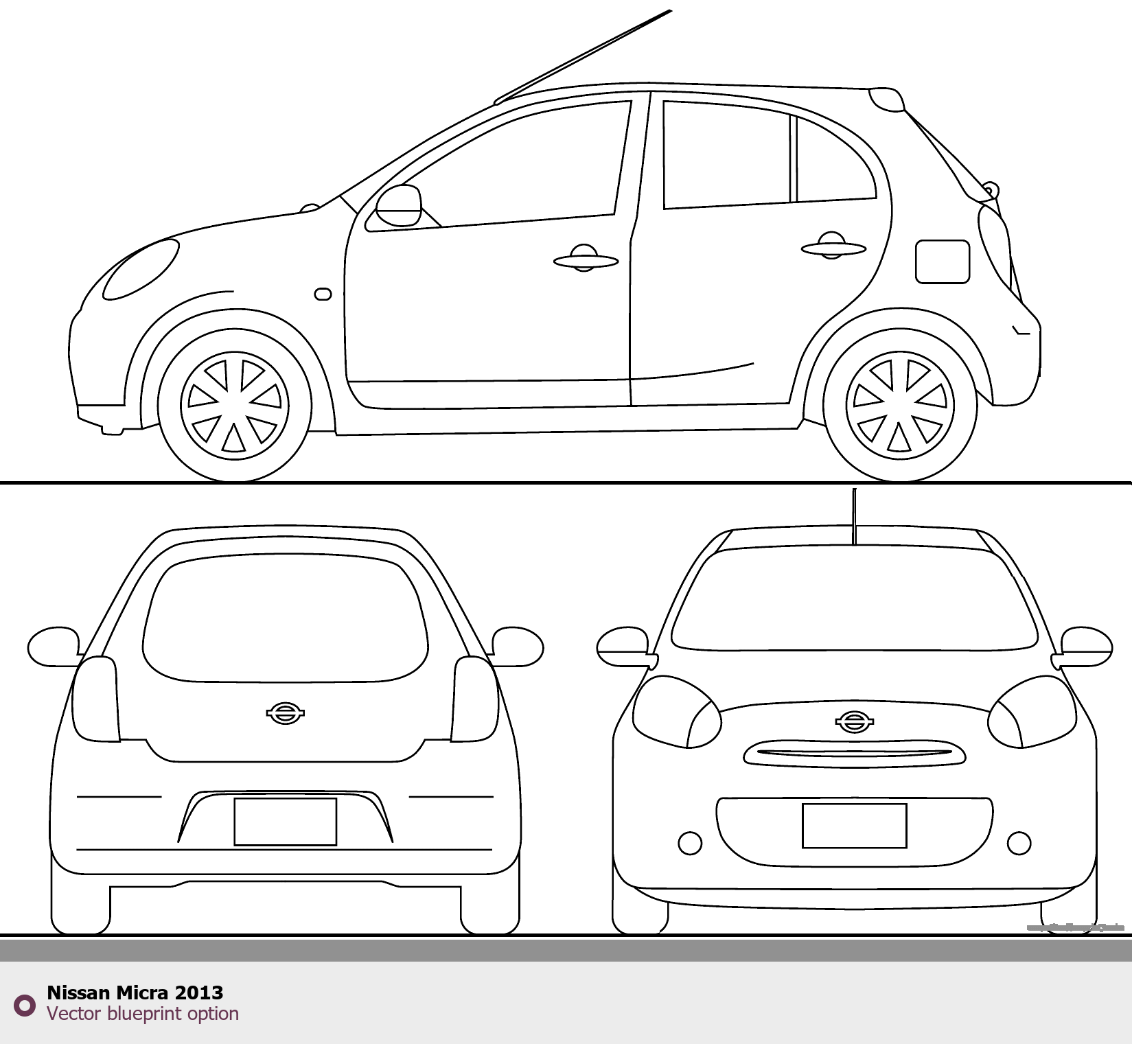Raster blueprint of the 2013 Nissan Micra Hatchback. This free downloadable image can be used for graphic projects, digital design, and 3D modeling. The file provides accurate exterior proportions of the vehicle. Model year: 2013. Body type: Hatchback.
